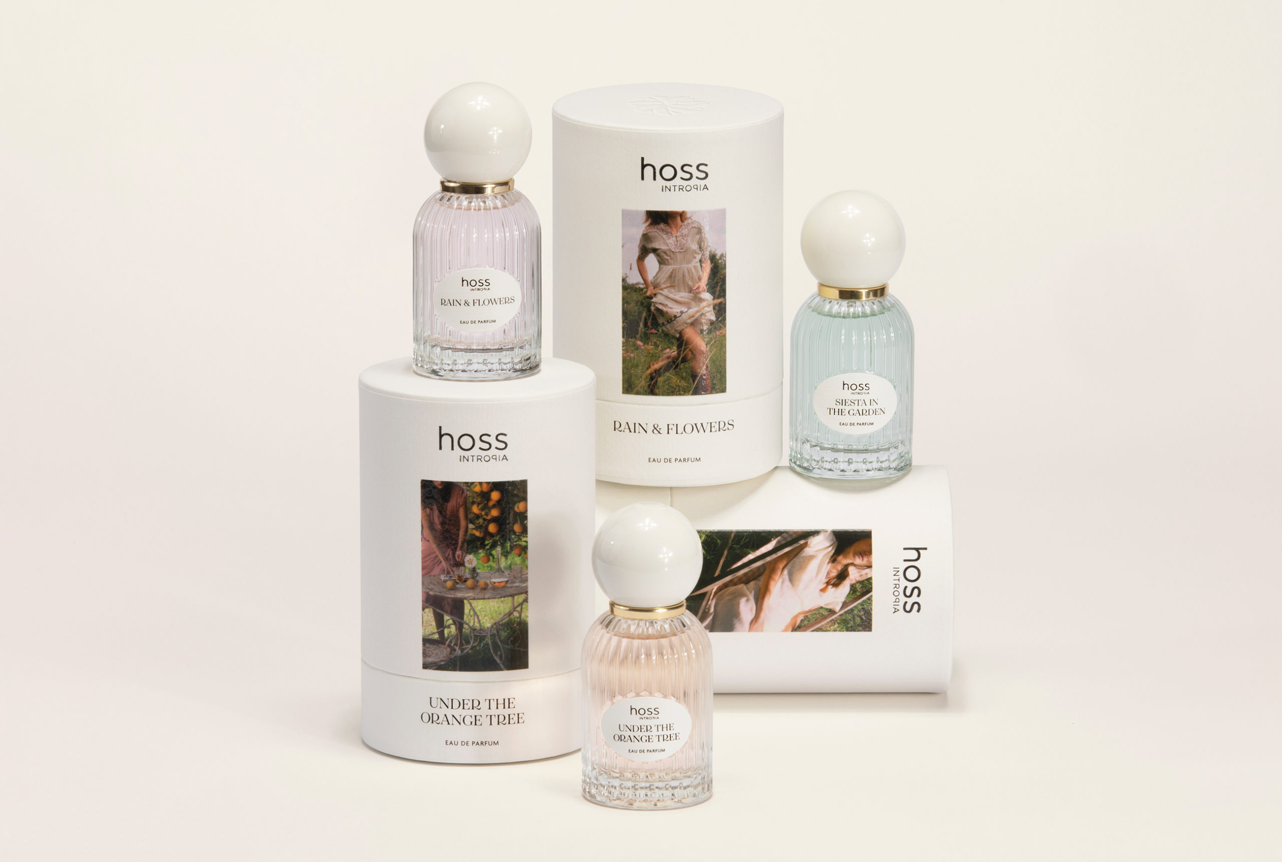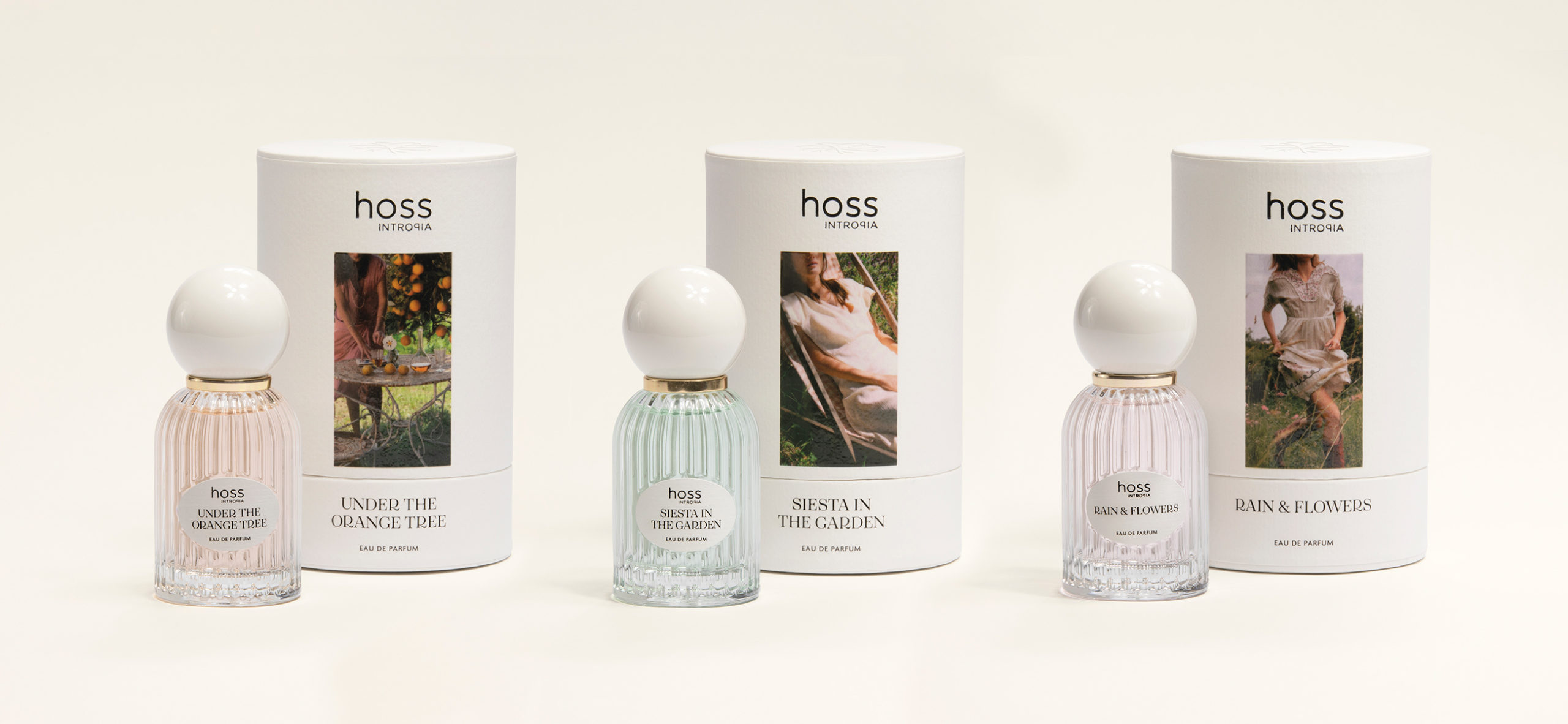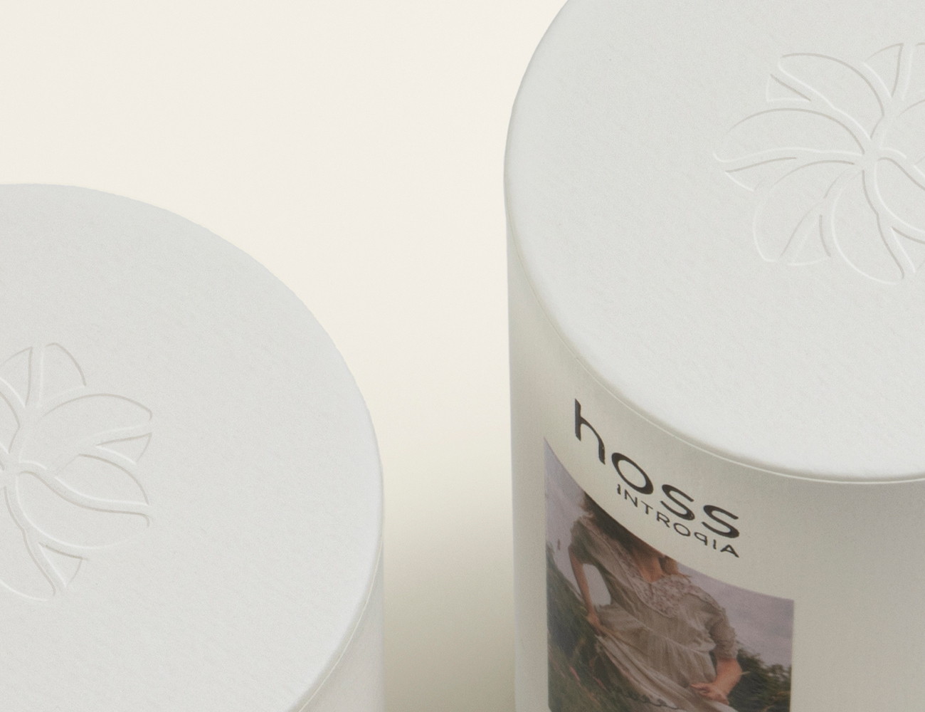 Each canister features small photographic vignettes that illustrate the essence of each fragrance, while the lid is finished with the Hoss Intropia emblem, embossed in blind as a subtle signature of nature.