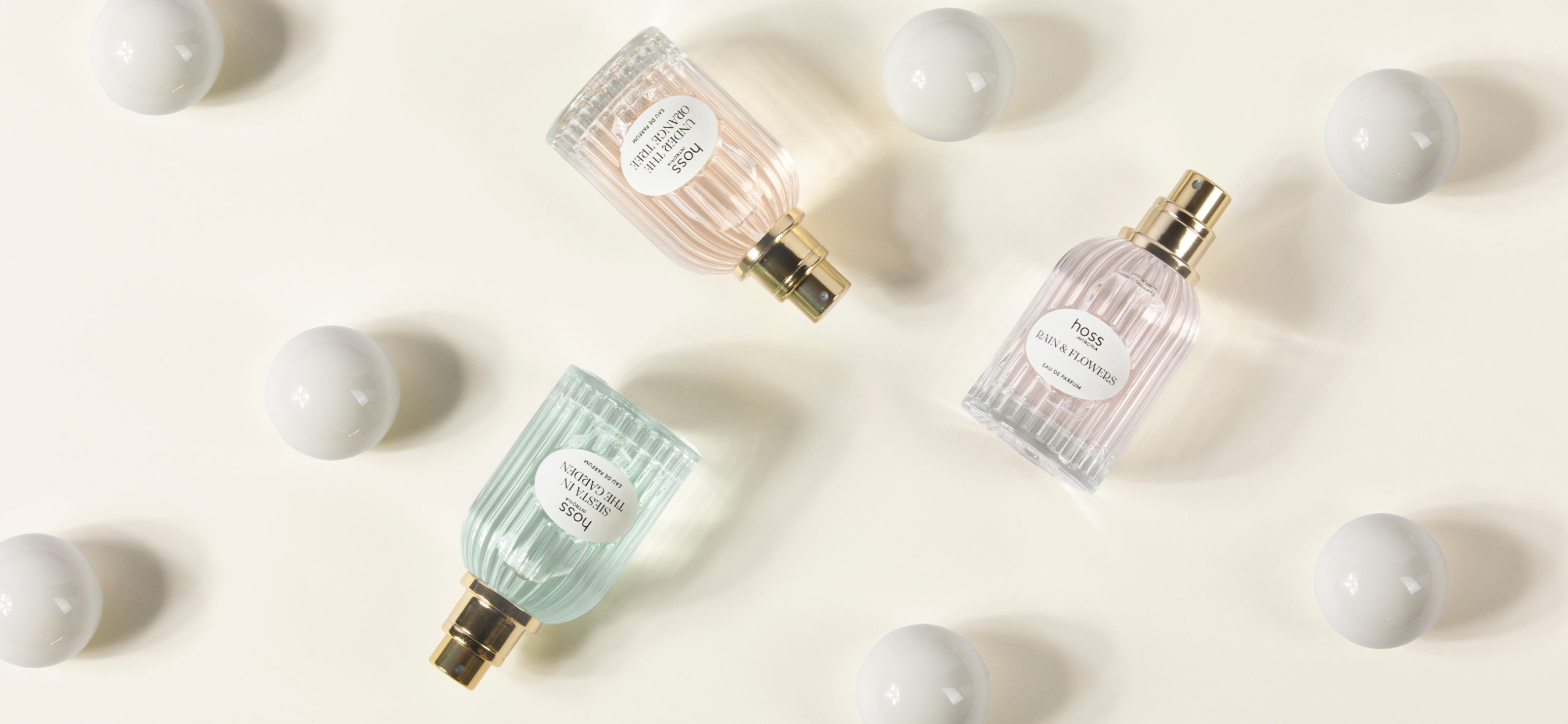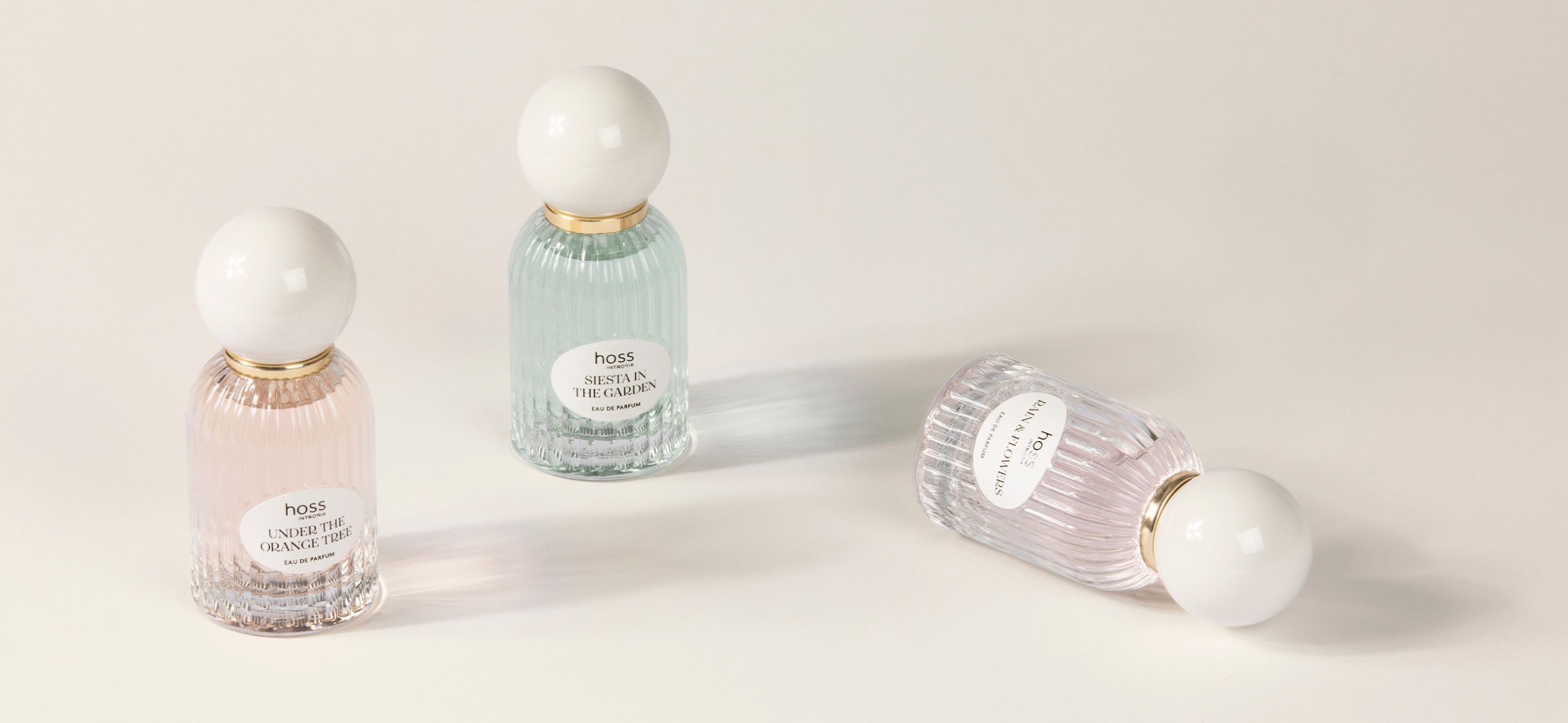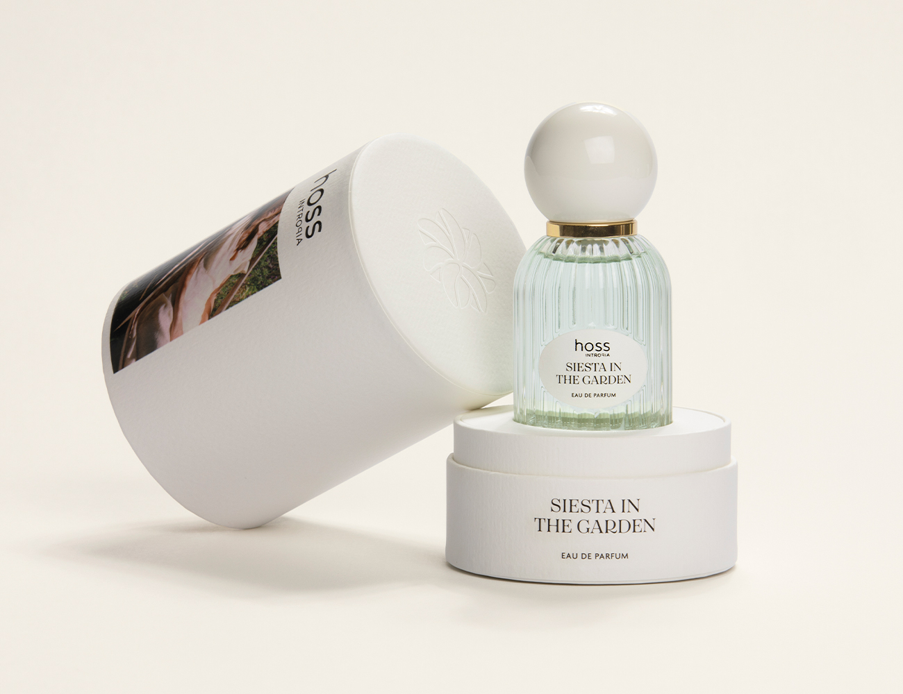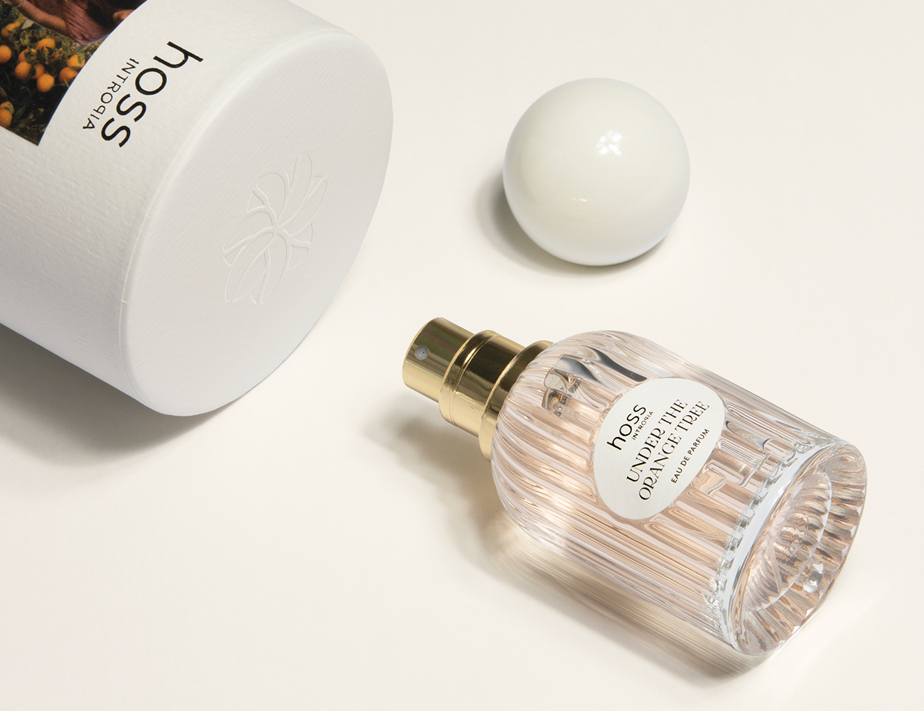 Each canister features small photographic vignettes that illustrate the essence of each fragrance, while the lid is finished with the Hoss Intropia emblem, embossed in blind as a subtle signature of nature.