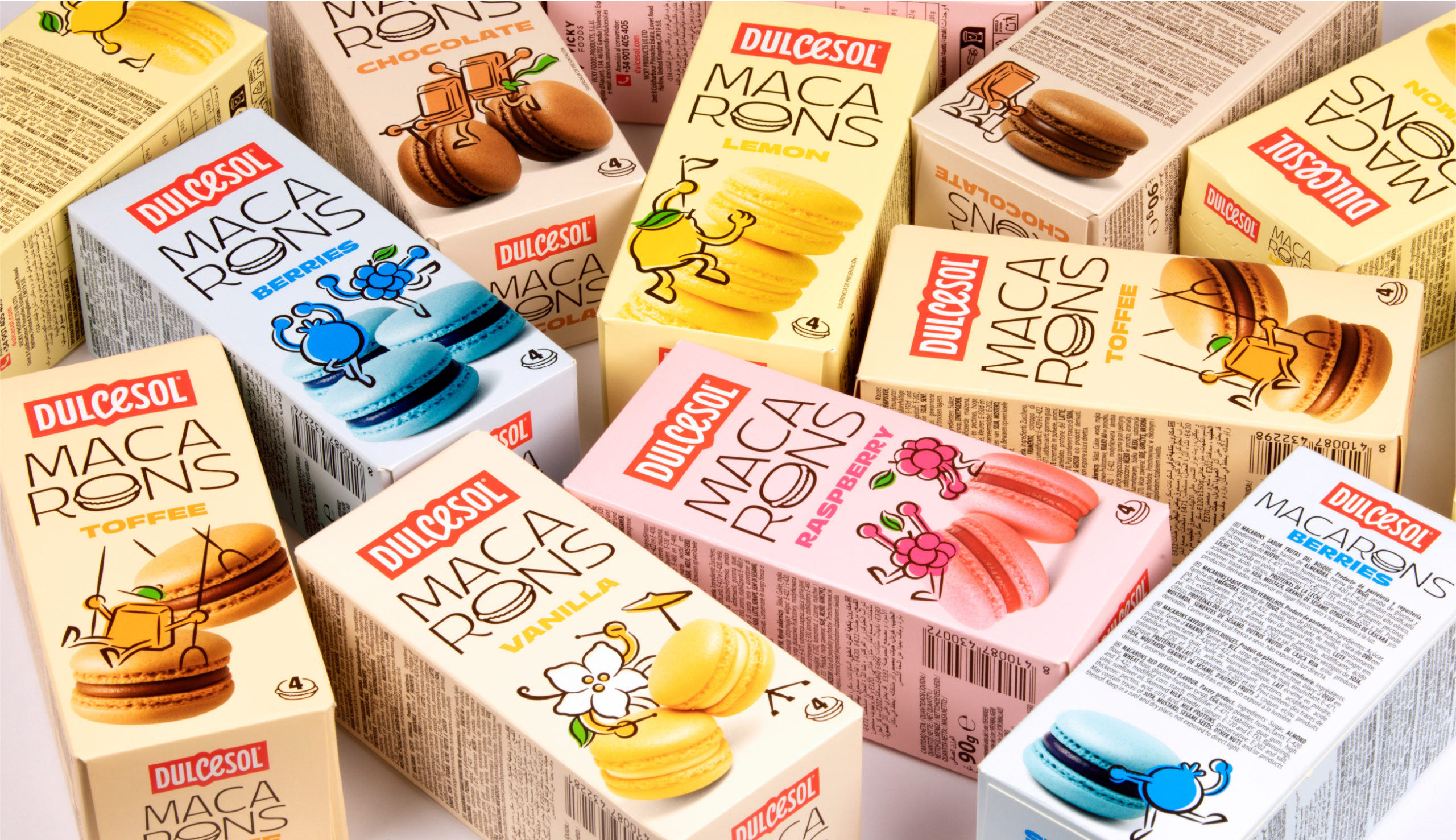 Packaging redesign for Dulcesol’s Macarons range, part of the Vicky Foods group.